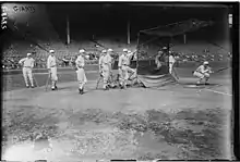 It is said that after one particularly satisfying victory over the Philadelphia Phillies, Mutrie (who was also the team's manager) stormed into the dressing room and exclaimed, "My big fellows! My giants!"[1] From then on (1885), the club was known as the Giants. However, more recent research has suggested that the New York World was already widely using the Giants nickname throughout the 1885 season, before the legendary game was played.[2]