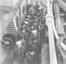 The Coast Guard's preparations for the coming war actually started before the Declaration of War on 6 April 1917.[33] In late 1916, the Interdepartmental Board on Coast Communications recommended that telephone communications be improved and brought to a high state of readiness all along the U.S. coastline to include lighthouses and lifesaving stations as well as other government coastal facilities.[34] Sensing a need for aviation, the Coast Guard sent Third Lieutenant Elmer Stone to Naval Flight Training on 21 March 1916.[35] On 22 March 1917 the Commandant issued a twelve-page manual titled Confidential Order No. 2, Mobilization of the U.S. Coast Guard When Required to Operate as a Part of the U.S. Navy.[33] Germany had already announced a policy of unrestricted submarine warfare on 30 January 1917, on all ships trading with its enemies and included neutral shipping as targets.[36] U.S. merchant ships sunk before a declaration of war included the SS Healdton and the SS Housatonic and five others with the loss of 36 American lives.[37]