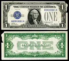 United States silver certificates were a type of representative money printed from 1878 to 1964 in the United States as part of its circulation of paper currency.[17] They were produced in response to silver agitation by citizens who were angered by the Fourth Coinage Act, and were used alongside the gold-based dollar notes. The silver certificates were initially redeemable in the same face value of silver dollar coins, and later in raw silver bullion.