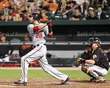 The Nationals started their season in a skid, falling to the bottom of their division. On April 28, 2015, after a seven-game losing streak, with rookie starting pitcher A. J. Cole on the mound, the Nationals found themselves in at a nine-run deficit against their archrival, the Atlanta Braves. But the team clawed back to win the game 13–12, overcoming their largest run deficit ever.[58] Over the coming weeks, the Nationals rebounded from their poor start to the season, rising to the top of the division behind a career-best season for outfielder Bryce Harper.[59][60] On June 20, 2015, the Nationals shut out the Pittsburgh Pirates, with Max Scherzer throwing a no-hitter that was nearly perfect. The game was the second no-hitter in Nationals history.[61] Scherzer became the first pitcher since Nolan Ryan in 1973 to throw two no-hitters in the regular season, shutting down the New York Mets on October 3, 2015, in a performance that also equaled Ryan's historic mark of 17 strikeouts in a no-hitter.[62][63] However, the Mets won the division, clinching it in late September.[64]