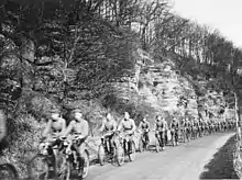 Although multiple-speed bicycles were widely known by this time, most or all military bicycles used in the Second World War were single-speed. Bicycles were used by paratroopers during the war to help them with transportation, creating the term "bomber bikes" to refer to US planes dropping bikes for troops to use.[43] The German Volksgrenadier units each had a battalion of bicycle infantry attached. The Invasion of Poland saw many bicycle-riding scouts in use, with each bicycle company using 196 bicycles and 1 motorcycle. By September 1939, there were 41 bicycle companies mobilized.[44]