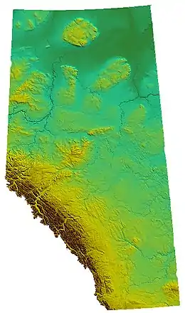"Those were the early days in Canada's petroleum industry. The cradle was in the east, but the industry only began to come of age with discoveries in western Canada, notably Alberta," according to McKenzie-Brown.[3] There, the Western Canadian Sedimentary Basin is at its most prolific. Alberta's first recorded natural gas find came in 1883 from a well at CPR siding No. 8 at Langevin, near Medicine Hat. This well was one of a series drilled at scattered points along the railway to get water for the Canadian Pacific Railway's steam-driven locomotives. The unexpected gas flow caught fire and destroyed the drilling rig."[3]