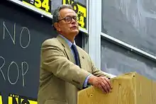 The only American member organization of the worldwide Socialist International was the Democratic Socialists of America (DSA) until mid-2017, when the latter voted to disaffiliate from that organization for its perceived acceptance of neoliberal economic policies.[237] In 2008, the DSA supported Democratic presidential candidate Barack Obama in his race against Republican candidate John McCain. Following Obama's election, many on the right[238] began to allege that his administration's policies were socialistic, a claim rejected by the DSA and the Obama administration alike. The widespread use of the word socialism as a political epithet against the Obama government by its opponents caused National Director Frank Llewellyn to declare that "over the past 12 months, the Democratic Socialists of America has received more media attention than it has over the past 12 years".[239] Noam Chomsky, a member of the DSA[240] and the Industrial Workers of the World,[241] is described by The New York Times as "arguably the most important intellectual alive"[242] and has been on the list of the most cited authors in modern history.[243] Redneck Revolt, a socialist pro-guns organization, was founded in 2009.[244][245][246] Although the group does not identify itself as part of the political left,[247] nor as politically liberal,[244] it has been argued that the group's ideology is a form of libertarian socialism.[248] The Socialist Rifle Association, a similar socialist organization,[249] was founded in 2018.[250][251]
