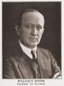 Internal strife caused a schism in the American left after Vladimir Lenin's successful revolution in Russia. Lenin invited the Socialist Party to join the Third International. The debate over whether to align with Lenin caused a major rift in the party. A referendum to join Lenin's Comintern passed with 90% approval, but the moderates who were in charge of the party expelled the extreme leftists before this could take place. The expelled members formed the Communist Labor Party and the Communist Party of America. The Socialist Party ended up, with only moderates left, at one third of its original size.[77] John Reed, Benjamin Gitlow and other socialists were among those who formed the Communist Labor Party while socialist foreign sections led by Charles Ruthenberg formed the Communist Party. These two groups would be combined as the Communist Party of the United States of America (CPUSA).[78] The Communists organized the Trade Union Unity League to compete with the AFL. By August 1919, only months after its founding, the Communist Party USA claimed 50,000 to 60,000 members.[79] Members also included anarchists and other radical leftists. In contrast, the more moderate Socialist Party of America had 40,000 members. The sections of the Communist Party's International Workers Order meanwhile organized for communism along linguistic and ethnic lines, providing mutual aid and tailored cultural activities to an IWO membership that peaked at 200,000 at its height.[80] (In 1928, following divisions inside the Soviet Union, Jay Lovestone, who had replaced Ruthenberg as general secretary of the CPUSA following his death, joined with William Z. Foster to expel Foster's former allies, James P. Cannon and Max Shachtman, who were followers of Leon Trotsky. Following another Soviet factional dispute, Lovestone and Gitlow were expelled and Earl Browder became party leader.[81])