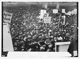 When the 1920s began, "the IWW was destroyed, the Socialist party falling apart. The strikes were beaten down by force, and the economy was doing just well enough for just enough people to prevent mass rebellion".[91] Thus, the decline of the socialist movement during the early 20th century was the result of a number of constrictions and attacks from several directions. The socialists had lost a major ally in the IWW Wobblies and their free speech had been restricted, if not denied. Immigrants, a major base of the socialist movement, were discriminated against and looked down upon. Eugene V. Debs—the charismatic leader of the socialists—was in prison, along with hundreds of fellow dissenters. Wilson's National War Labor Board and a number of legislative acts had ameliorated the plight of the workers.[92] The socialists were regarded as being "unnecessary", the "lunatic fringe" and a group of untrustworthy radicals. The press, courts and other establishment structures exhibited prejudice against them. After crippling schisms within the party and a change in public opinion due to the Palmer Raids, a general negative perception of the far-left and attribution to it of terrorist incidents such as the Wall Street Bombing, the Socialist Party found itself unable to gather popular support. At one time, it boasted 33 city mayors, many seats in state legislatures and two members of the House of Representatives.[93] The Socialist Party reached its peak in 1912 when Debs won 6% of the popular vote.[94]