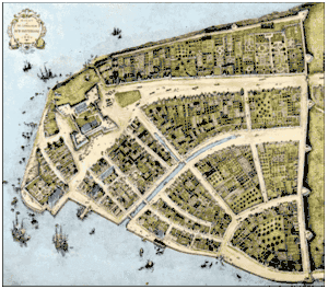 The early Dutch city of Nieuw Amsterdam (New Amsterdam) took full advantage of the rivers which surrounded the city, foreshadowing the empire that New York's shipping industry would establish two centuries later. According to the Castello Plan, multiple canals and waterways were built, including a very early canal on the present-day Broad Street, which was called the Heere Gracht. According to Burrows, et al.,[1] a municipal pier was built on what is now Moore Street, on the East River. The first regional ground transportation that was built out of Nieuw Amsterdam was a "wagon-road" that linked to Nieuw Haarlem (Harlem). It was built in 1658 to encourage development of that town, by order of Petrus Stuyvesant, who saw that Nieuw Haarlem could provide an important measure of defense for Nieuw Amsterdam.