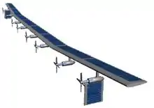 The wing was built in five segments of equal span. Two gondolas hung from the center segment, which carried payload, radio control and telemetry electronics, and other gear. The gondolas also provided the landing gear. Each gondola had dual baby-buggy wheels in front and a bicycle wheel in back for landing gear. HALSOL was propelled by eight small electric motors driving variable-pitch propellers. There were two motors on the center wing segment, two motors on each inner wing segment, and one motor on each outer wing segment. The aircraft's total weight was about 185 kilograms (410 pounds), with about a tenth of that being payload.