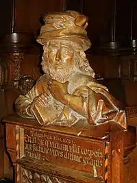 It is hard to compare the figure work of England with that on the Continent owing to the disastrous effect of the Reformation. But when we examine the roofs of the Eastern counties, the bench ends of Somerset, or the misericords in many parts of the country, we can appreciate how largely wood sculpture was used for purposes of decoration. If as a rule the figure work was I not of a very high order, we have conspicuous exceptions in the stall elbows of Sherborne, and the pulpit of Trull, Somerset. Perhaps the oldest instance is the often mutilated and often restored effigy of Robert, Duke of Normandy, in Gloucester Cathedral (12th century), and carved, as was generally the case in England, in oak. At Clifton Reynes, Buckingham, there are two figures of the 13th century. They are both hollowed out from the back in order to facilitate seasoning the wood and to prevent cracking. During the 13th, 14th and 15th centuries there are numberless instances of figure carving of the most graphic description afforded in the misericords in many of our churches and cathedrals. But of figures carved in the round apart from their surroundings hardly an instance remains. At the little chapel of Cartmel Fell, in the wilds of Westmorland, there is a figure of Our Lord from a crucifix, some 2 ft 6 in (0.76 m) in length. The cross is gone, the arms are broken away, and the feet have been burned off. A second figure of Our Lord (originally in the church of Keynes Inferior) is in the museum of Caerleon, and a third, from a church in Lincolnshire, is now in a private collection. On the continent some of the finest figure work is to be found in the retables, some of which are in the Victoria and Albert Museum. A Tirolese panel of the 15th century carved in high relief, representing St John seated with his back to the onlooker, is a masterpiece of perspective and foreshortening, and the drapery folds are perfect. The same may be said of a small statue of the Virgin, carved in lime by a Swiss hand, and some work of the great Tilman Riemenschneider of Wurzburg (1460–1531) shows that stone sculptors of medieval times were not ashamed of wood.