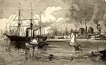When the U.S. entered World War I, the Hamburg-American Line piers in Hoboken (and New Orleans) were taken under eminent domain.[55] Federal control of the port and anti-German sentiment led to part of the city being placed under martial law, and many German immigrants were forcibly moved to Ellis Island or left the city of their own accord.[56] Hoboken became the major point of embarkation and more than three million soldiers, known as "doughboys", passed through the city.[57] Their hope for an early return led to General Pershing's slogan, "Heaven, Hell or Hoboken... by Christmas."[58]