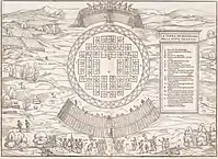 The primary source of documentation that allows us to appreciate both the configuration and position of this village is Bref récit et succincte narration de le navigation faite en MDXXXV et MDXXXVI, which Cartier gave to King Francis I of France in 1545. We know of a plan titled La Terra de Hochelaga nella Nova Francia, which illustrates, in the European manner of the period, Cartier's visit. Giacomo Gastaldi illustrated Hochelaga in the third volume of Delle navigationi et viaggi, a work done in Venice between 1550 and 1556 by Giovanni Battista Ramusio. The perfect, regular arrangement of the houses, conforming to the urban ideal of the Italian Renaissance, as well as the boards covering the village's palisade, were probably his own fabrications. In fact, if the plan faithfully illustrates the notes of the French explorer, it offers little resemblance to ethnohistorical reality.[8] A reproduction of La Terra de Hochelaga by Paul-Émile Borduas decorates the walls of the Grand Chalet of Mount Royal Park.