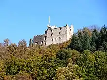 A different Castle Geroldseck was built in the thirteenth century on lands of the Lower Line in what is today the commune of Niederstinzel in the Wasgau region of Alsace. Hans of Geroldseck ruled from the castle as a fief of the Bishop of Metz from 1355 until his death in 1391, after which time his rights devolved to the Lords of Ochsenstein and the counts of Zweibrücken-Bitsch. Castle Geroldseck itself was destroyed by fire in 1381. Old German folktales regarded the ruins as the meeting place of great heroes, such as Ariovistus, Herman, Widukind, and Siegfried. Legends claimed that, when the Germans would be in the greatest need, these heroes would come out from the castle to help them.[4]