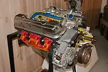 The Holden V8 is a water-cooled naturally-aspirated 4-stroke gasoline engine featuring eight cylinders arranged in a 90 degrees vee-formation. It is an overhead valve design featuring two valves per cylinder with a camshaft centrally located in the engine block above the crankshaft, driven by a timing chain attached to toothed sprockets, with the camshaft in turn driving the distributor and oil pump. Valve actuation is by hydraulic lifters and pushrods to rocker arms (roller rollers in some models) in the cylinder heads; the lifter bore angle in the engine block is 45 degrees from the block centerline. A belt-driven radiator fan and water pump are located on the front of the engine block taking drive from the main pulley, as is the alternator. The cast iron engine block features a separate pressed steel non-stress bearing sump assembly with the crankshaft located within five main bearing journals secured with 2-bolt bearing caps; 4-bolt main bearing caps featured on later performance versions.[2][3]