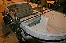 A Hollander beater is a machine developed by the Dutch in 1680 to produce paper pulp from cellulose containing plant fibers. It replaced stamp mills for preparing pulp because the Hollander could produce in one day the same quantity of pulp it would take a stamp mill eight days to prepare.[1]