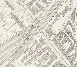 King's Cross station opened on 14 October 1852, replacing the temporary terminus at Maiden Lane which closed.[1] At its opening, Holloway & Caledonian Road had only a single up platform available for the use of alighting passengers; the first stop for passengers travelling from King's Cross was Finsbury Park. Full services in both directions were available from 1 August 1856.[1] The platforms were located partly on the railway's viaduct and partly on the railway bridge over Holloway Road.