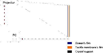 The computer sends the image to the projector. The projector generates light beams which form the image on the screen. When the user touches the screen, a tactile membrane film reacts to these movements, generating electrical impulses that are sent back to the computer. The computer interprets the received impulses and modifies the projected image according to the information.