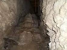 The second area of masks was found 8 metres (26 ft) inside the main looters' tunnel. There are three masks fashioned from limestone blocks and covered with a 30-centimetre (12 in) thick coating of stucco. These masks are angled at 45°. The lowest is a zoomorphic mask with feline features that measures 87 by 86 centimetres (34 by 34 in). Immediately above it is another mask measuring 130 by 86 centimetres (51 by 34 in). It is an anthropomorphic mask in a good state of preservation with circular eyes, a prominent upper lip, a flattened nose and a downturned mouth. The third mask was destroyed by the looters' excavations and was estimated to have a height of 1.6 metres (5.2 ft) based on remaining stucco fragments.[30]
