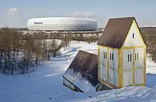 With the construction of the nearby Allianz Arena, an international competition for an artwork was initiated which was won by Timm Ulrichs. He created a copy of the church as building structure as the Fröttmaninger Berg had been included in the competition area. The focus is on the disappearance of the former village of Fröttmaning. Approximately 150 meters south of the Holy Cross Church, in 2006, an untraceable look-alike of the Romanesque church was created in original size from painted precast concrete parts. The surreal-melancholic work of art "sunken village" at the foot of the Fröttmaning mountain of rubble is a kind of a loss display, the disappearing in this place. The copy was arranged in such a way that the building seems half buried from the mountain.