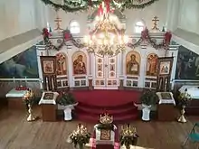The Holy Resurrection Orthodox Church was designed by John Bergesen, an architect from New York City. The church was built with six onion domes, which was common in Russian architecture of that period. The dimensions of the church are 36 by 63 feet (11 by 19 m), which does not include the main entrance, and a height of approximately 100 feet (30 m). The inside of the church is divided into three parts: the vestibule, the nave, and the sanctuary.[2] Its icons were some of the last ones to leave Russia before Czar Nicholas II was overthrown.