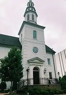 In 2010 the church purchased a plot of land across the street from William Peace University, to construct a new church building, and the Jordan House, a Queen Anne Victorian mansion on North Blount Street built in 1898 for Dr. Thomas M. Jordan, to be used as the church offices[7][8][9] Construction began on a new church building in June 2014.[10] The new church cost around $7.5 million to build. The church is built in the colonial style. It is over 25,000 square feet and has a 130-foot tall steeple.[11] When the new building for Holy Trinity opened in September 2015, it was the first church opening to take place in downtown Raleigh since 1958, when Edenton Street United Methodist Church was rebuilt following a fire in 1956.[12] Over five hundred people attended the first service held at the new church building.[12] The church was dedicated by Bishop Steve Wood on November 8, 2015.[2]
