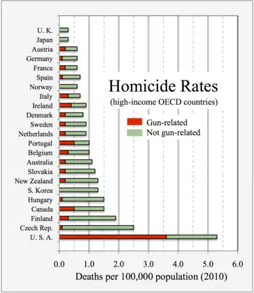 - Grinshteyn, Erin; Hemenway, David (March 2016). "Violent Death Rates: The US Compared with Other High-income OECD Countries, 2010". The American Journal of Medicine. 129 (3): 266–273. doi:10.1016/j.amjmed.2015.10.025. PMID 26551975. (Table 4). (PDF Archived 2 February 2019 at the Wayback Machine).