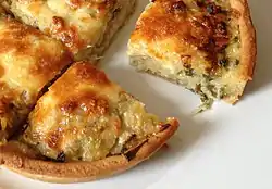 Homity pie is a traditional British open vegetable pie. The pastry case contains a filling of potatoes and an onion and leek mixture, which is then covered with cheese.[1]