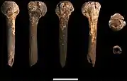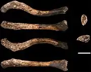 Like modern humans, but unlike fossil hominins (including South African australopithecines, H. erectus, and Neanderthals), the permanent 2nd molar erupted comparatively late in life, emerging alongside the premolars instead of before, which indicates a slower maturation unusually comparable to modern humans.[16] The tooth formation rate of the front teeth is also most similar to modern humans.[17] The overall size and shape of the molars most closely resemble those of three unidentified Homo specimens from the local Swartkrans and East African Koobi Fora Caves, and are similar in size (but not shape) to Pleistocene H. sapiens. The necks of the molars are proportionally similar to those of A. afarensis and Paranthropus.[18] Unlike modern humans and contemporary Homo, H. naledi lacks several accessory dental features, and has a high frequency of individuals who present main cusps, namely the metacone (midline on the tongue-side) and hypocone (to the right on the lip-side) on the 2nd and 3rd molars, and a Y-shaped hypoconulid (a ridge on the lip-side towards the cheek) on all 3 molars. Nonetheless, H. naledi also has many dental similarities with contemporary Homo.[19]