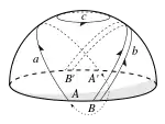 On the ordinary sphere , the cycle b in the diagram can be shrunk to the pole, and even the equatorial great circle a can be shrunk in the same way. The Jordan curve theorem shows that any arbitrary cycle such as c can be similarly shrunk to a point. All cycles on the sphere can therefore be continuously transformed into each other and belong to the same homology class. They are said to be homologous to zero. Cutting a manifold along a cycle homologous to zero separates the manifold into two or more components. For example, cutting the sphere along a produces two hemispheres.