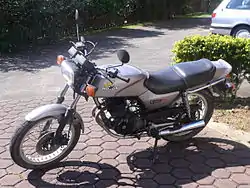 The Honda CB250RS is a 250 cc motorcycle designed for road use. It was produced until the mid-1980s. It has a high-compression four-stroke, four-valve, air-cooled, single-cylinder engine, which was an upgrade of the engine built for the earlier XL250S trail bike. The RS is known for its slim build, with a dry weight of only 128 kg, and nimble handling. The engine featured counter rotating balancers, which reduced vibration and allowed a lighter frame. Further weight savings were achieved by making the engine a stressed component. Early models were kick-started (with an automatic decompression lever), while later Deluxe models (designated RS-D / RSZ) came with electric start and different paintwork. The bike has a front disc brake and rear drum brake, and while it had only a single-cylinder, it had twin exhausts; one for each port.
