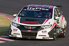 Gabriele Tarquini and Tiago Monteiro entered the 2013 FIA World Touring Car Championship with Civic WTCC cars.[51] Three Honda Civic race cars made a clean sweep in races held in Slovakia and Shanghai by winning the first, second and third positions.[66] Honda Racing Team JAS and Zengő Motorsport entered the 2013 WTCC tournament.[67] Gabriele Tarquini won the overall second place in the 2013 WTCC drivers' championship and Honda won the Manufacturers' World Championship.[68] The cars used a 1.6-litre inline-4 direct injection turbocharged engine with an intercooler and a dry oil sump.