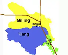 The Gilling territory consisted mainly of land which lay between the River Tees and the River Swale, with the Tees forming the northern border which separated the land from that granted to the Bishop of Durham. The western border was the watershed of the Pennine Hills and the southern border was the watershed between the River Ure and the Swale. The River Wiske formed the eastern border. The manor of Gilling, close to the boundary, was the caput of the barony until Count Alan moved it to Richmond Castle. The division of Hang, or Hangshire, had the River Swale as its northern boundary; its western boundary was the Pennine watershed and its southern boundary was the watershed with the River Wharfe and the River Nidd. The eastern border followed small streams and minor landmarks from the previous watershed to the Swale. The wapentake meeting place was situated on the Hang Beck in Finghall parish. The third part of the territory, Hallikeld, consisted of the parishes lying between the River Ure and the River Swale until their confluence at Ellenthorpe.