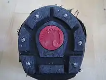 Hoof boots are commonly seen as a substitute to horseshoes, either as a backup for a thrown shoe when a farrier is not available, or as an alternative form of hoof protection for a barefoot horse. Horse boots are used in all riding disciplines and are particularly popular for trail riding and endurance riding. They are also used on horses in parades and on police horses who work on hard pavement. Hoof boots may also be used when transitioning a horse from shod to unshod riding, or carried during a ride in case a horse throws a shoe.[2] In areas with persistently slippery conditions in winter, hoof boots are often used in combination with studs screwed into the soles.[3] This allows the horse to be ridden safely on slippery surfaces. This must be done with a hoof boot with a sufficiently thick and inflexible sole to avoid bruising of the hoof sole. Boots with soles that are too flexible are unsuitable for studding.