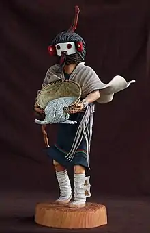 Kachina figures can also carry accessories that are associated with what their respective kachinam will carry during the ceremonial dances.[31] Figures are portrayed with accessories including hand rattles made from gourds, bows and arrows, branches of Douglas fir, staffs, scissors, crooks with children, and colored corn. Sometimes the objects carried relate to the function of the Kachina; for example, Cold-Bringing Woman carries a sifter basket of snow and scatters it encouraging moisture in the form of snow for bountiful crops.[32] Sometimes, to hide the space between the body and the mask, ruffs made of fox skin, juniper branches, Douglas fir, or cloth will be worn. In addition, headdresses are sometimes worn on the heads of the dolls. Common doll headdresses include maiden-whorls on the sides of the head, an eagle feather on the mask, or a tripod of sticks worn on top of the head.[33]