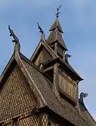 The church is a triple-nave stave church of what is known as the Borgund-type. It has three portals, and the western portal is an excellent example of Middle Age wood carving. The motifs are of a romance character, often associated with European influence. The nave is a raised central room with an aisle around it, and the choir is apsidal and narrower than the nave.[5]