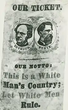 With the nomination forced upon him, Seymour committed himself to the campaign. He faced considerable challenges; his opponent, General Ulysses S. Grant, enjoyed the support of a unified Republican party and most of the nation's press. While he generally adhered to the tradition that presidential nominees did not actively campaign, Seymour did undertake a tour of the Midwest and the mid-Atlantic states in mid-October. In his campaign Seymour advocated a policy of conservative, limited government, and he opposed the Reconstruction policies of the Republicans in Congress. Seymour's campaign was also marked by pronounced appeals to racism with repeated attempts to brand General Grant as the "Nigger" candidate and Seymour as the "White Man's" candidate.[6] The Republican campaign, by contrast, was the first in which they "waved the bloody shirt", highlighting Seymour's support for mob violence against African-Americans. Though Seymour ran fairly close to Grant in the popular vote, he was defeated decisively in the electoral vote by a count of 214 to 80.[4]:443–484 Subsequent to Seymour's loss, the Fifteenth Amendment to the federal Constitution was adopted which not only guaranteed the federal right to vote for recently emancipated slaves and others of African ancestry but also compelled New York State to reinstate voting rights for such citizens.