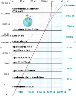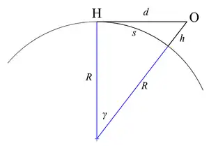 Another relationship involves the great-circle distance s along the arc over the curved surface of the Earth to the horizon; with γ in radians,