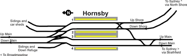On 1 January 1890, Hornsby became a junction station with the opening of the North Shore line to St Leonards. In 1894, a third platform was built along with a locomotive depot to the east of the station.[4] Hornsby was the northern extremity of the electrified network from 1930 until it was extended to Gosford in 1960. The wires did continue north of the station as far as the Hornsby Maintenance Depot.