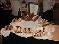 The term appetiser (American English: appetizer) is a synonym for hors d'oeuvre. It was first used in the United States and England simultaneously in 1860. Americans also use the term to define the first of three courses in a meal, an optional one generally set on the table before guests were seated.[10] Drinks before dinner became a custom towards the end of the 19th century. As this new fashion caught on, the British took inspiration from the French to begin serving hors d'oeuvres before dinner.[26] A cocktail party is considered a small gathering with mixed drinks and light snacks.[27] Hors d'oeuvres may be served as the only food offering at cocktail parties and receptions, where no dinner is served afterward.[28] After the end of prohibition in the United States, the cocktail party gained acceptance.[9][10] Prior to the First World War, American dinner guests would be expected to enter the dining room immediately where drinks would be served at the table with appetisers. This changed by the 1920s, when hors d'oeuvres were served prior to a non-alcoholic cocktail; however, after the repeal of Prohibition in the United States, cocktail parties became popular with many different hors d'oeuvres meant as something to help counter the stronger drinks.[10][12] It is the cocktail party that helped transfer the hors d'oeuvres from the formal dining table to the mobility of the serving tray. These appetisers passed around the cocktail party may also be referred to as canapés.[12]
