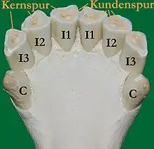- Pulp mark/Dental star: After some wear has occurred on the teeth, the central pulp cavity is exposed, and the tooth is marked by a "dental star" or "pulp mark" that is smaller than the incisor cups. These begin as a dark line in front of the dental cup, which grows in size and becomes more oval in shape as the cups are worn away. Dental stars are usually first visible at age 6, on the animal's lower central incisors, and very visible by age 8. They appear on the lower intermediates by age 9, and on the other incisors between the ages of 10–12 years.