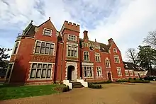 Roffey is north east of the centre of Horsham and as a hamlet dates back to at least the 13th century, with taxation records of 1296 showing 18 liable people in the area.[5] Kelley's Post Office Directory for 1867 describes 'Roughey' as consisting 'of a few farmhouses and cottages. Here is an iron church, capable of accommodating 80 persons'.[7] Maps of the 1880s show Roffey Corner (still spelt Roughey), but appear to label the hamlet as Star Row, with Roffey in use again by the start of the 20th century.[5][8] A railway station opened as Roffey Road Halt in 1907, closing in 1937. The station is shown in the location now known as Wimland Road.[8] Roffey is a separate ecclesiastical parish with its own parish church—All Saints' Church on Crawley Road, designed in 1878 by Arthur Blomfield. It replaced a temporary building which was licensed for worship in 1856.[9] Roffey Park Institute is based just outside of Horsham, near Colgate.