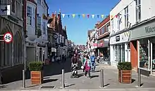 Horsham's town centre has many national chain stores, and although it has suffered the loss of some small and independent retailers, the town retains its reputation for individuality and attracts shoppers from a wide area.[16] In 1992 the town centre was redesigned to reduce significantly the flow of traffic through the town's main shopping streets, and West Street was pedestrianised by 1977. Much of the Carfax, which once consisted of two concentric rings of roads, was pedestrianised to create a new town square. The underground toilets that once served the Carfax are now underneath the war memorial. The bandstand was moved to its present site from the south corner of the Carfax. The Victorian drinking fountain now at the southern end of North Street originally stood on the Carfax.