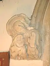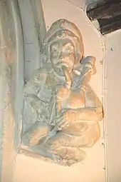 Around 1400 the present west tower and tower arch were built. The tower arch features two unusual almost life-size sculptures of human figures: one playing the bagpipes and the other showing an expression of amazement.[7] Also in the 15th century the pitch of the nave roof was greatly reduced in typical Perpendicular Gothic style.[7] Late in the 15th century, Perpendicular Gothic windows were inserted in both sides of the chancel and the north wall of the nave. The Perpendicular Gothic piscinae in the chancel and south transept are also 15th century.[3]