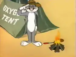 Bugs hides in a closet, not noticing a skeleton in there, and comes out scared when he does see it. Then, when chased into the laboratory, he makes an ostensibly explosive cocktail and threatens the scientist with it, saying: "One more step and I'll blow ya up! This contains manganese, phosphorus, nitrate, lactic acid, and dextrose!" The scientist laughingly dismisses the threat, telling Bugs the aforementioned ingredients are the formula for a chocolate malt and Bugs drinks it, saying, "Yum, yum! I'm a better scientist than I thought.". Then Bugs hides near an oxygen tent disguised as a Boy Scout, leading the scientist in the wrong direction and Bugs sits up and salutes, "That was me good deed for the day!".