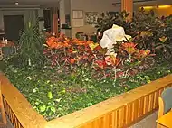 Indoor plants reduce components of indoor air pollution, particularly volatile organic compounds (VOC) such as benzene, toluene, and xylene. These VOC's have been reported to reduce by about 50-75% with the presence of a houseplant. The compounds are removed primarily by soil microorganisms.[22] Some tests of benzene purification by houseplants noticed that plants can makeup and convert benzene, then transform it to a carbon use for future use.[23] Plants can also remove carbon dioxide, which is correlated with lower work performance, from indoor areas.[24] The effect has been investigated by NASA for use in spacecraft.[25] Plants also appear to reduce airborne microbes and increase humidity.[26]