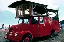 Most 1970s mobile homes were constructed from the chassis upwards utilising predominantly cheap recycled materials. Throughout this era house-truck rigs were constructed on the decks of old ex farm trucks which could then be purchased for $500 to $2500. House-buses were either stripped down to the chassis in preparation for construction or just added onto, to facilitate increased living areas. As opposed to the bright colourful American and British versions of the 1960s, many of the early Kiwi rigs were finished in earthy colored timber exteriors. This was due in part to the fact that in the 1970s the Toyota Motor company imported their new vehicles from Japan in car-crates which were constructed from reasonable quality marine grade plywood. The crates came with good quality framed floors. These were the perfect material in which to construct and clad a house truck. In the 1970s one could then purchase a complete car crate (six-sided) for around $25. An average size house-truck took up most of five car crates to build. In the 1970s a large number of derelict country farm houses from New Zealand's early colonial days were being demolished, these containing a treasure-trove of beautiful recyclable rare timbers such as kauri, totara and rimu. Other materials were purchased from timber recyclers and secondhand traders. One could purchase cheaply a good second-hand wood fired potbelly or small wood stove with a wetback attached, for cooking, heating hot water and warmth over the winter months. As most housetrucks parked in non residential areas very few of the early housetrucks were wired up for mains electricity. Gas lighting and candles were the norm. Some trucks utilized a small gas or kerosene stove to supplement cooking over hot summer months. All these items were purchased second hand. Some early 1970s rigs experimented with homemade wind turbines for lighting; however these large units even though they were fastened to the roof during travel, proved awkward. Today smaller modern units can be purchased at a reasonable price. Innovative housetruckers looking for the complete self-sufficient unit attached gas producer units to their rigs, effectively running their engines for free on charcoal gas.[1]