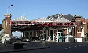 In 1893, coinciding with the first renaming, a new building was provided to the west. This contains the current ticket office and other station facilities. A large steel and glass porte-cochere stands outside at an angle, sheltering the taxi rank, forecourt and entrance area. This was moved from London Victoria following rebuilding works there which had rendered it redundant.