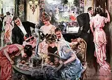 During the Great Depression, Christy found new success as a muralist and painter of historical events.[6][7] In 1934 he painted a series of female nudes to decorate the New York City restaurant Café des Artistes.[6] Some of Christy's works, newly cleaned, are on display at The Leopard at des Artistes restaurant, the successor to the Café des Artistes.[8] They include six panels of wood nymphs and paintings such as The Parrot Girl, The Swing Girl, Ponce De Leon, Fall, Spring and the Fountain of Youth.[9]