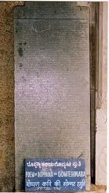 Other well-known personalities from the 12th century included several Jain writers. These include Aggala, who authored Chandraprabhapurana (1189),[72] an account of the life of the eighth Jain tirthankar Chandraprabha; Sujanottamsa, who wrote a panegyric on Gomateshwara of Shravanabelagola; and Vritta Vilasa, who authored Sastra sara and Dharmaparikshe (1160). The latter was Vilasa's version of the Sanskrit original of the same name written by Amitagati c. 1014. In this champu writing, the author narrates the story of two Kshatriya princess who went to Benares and exposed the vices of the gods after discussions with the brahmins there. The author questions the credibility of Hanuman (the Hindu monkey god) and the Vanaras (monkey-like humanoids in the Hindu epic Ramayana). Although controversial, the work sheds useful information on contemporary religious beliefs.[78][79] Kereya Padmarasa, a Veerashaiva poet patronised by King Narasimha I, wrote Dikshabodhe in the ragale metre in 1165. He would later become the protagonist of a biographical work called Padmarajapurana written by his descendant Padmanaka in c. 1400.[80] The brahmin poet Deva Kavi authored a romance piece called Kusumavali (1200), and brahmin poet Kavi Kama (12th century) authored a treatise called Sringara-ratnakara on the rasa (flavor) of poetical sentiment.[36] Sumanobana (1170) was a poet-grammarian and the Katakacharya ("military teacher") under King Narasimha I. He was also a priest in Devagiri, the Seuna Yadava capital.[26][38]