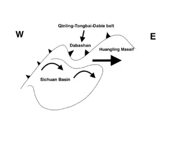 - During Lower Mesozoic, the northern notch of Qinling-Dabie belt and the clockwise rotation of the Sichuan Basin squeezed Huangling massif to escape to the east, forming an asymmetric ramp anticline trending N-S with steeper eastern flank and gentler western flank.[3] Controversy arose that the eastern flank of the anti-dome is steeper than the western flank, which is not fitting the geometry of Huangling complex.[30][31]