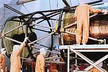 Construction of the Perkin-Elmer mirror began in 1979, starting with a blank manufactured by Corning from their ultra-low expansion glass. To keep the mirror's weight to a minimum it consisted of top and bottom plates, each one inch (25 mm) thick, sandwiching a honeycomb lattice. Perkin-Elmer simulated microgravity by supporting the mirror from the back with 130 rods that exerted varying amounts of force.[33] This ensured the mirror's final shape would be correct and to specification when finally deployed. Mirror polishing continued until May 1981. NASA reports at the time questioned Perkin-Elmer's managerial structure, and the polishing began to slip behind schedule and over budget. To save money, NASA halted work on the back-up mirror and put the launch date of the telescope back to October 1984.[34] The mirror was completed by the end of 1981; it was washed using 2,400 US gallons (9,100 L) of hot, deionized water and then received a reflective coating of 65 nm-thick aluminum and a protective coating of 25 nm-thick magnesium fluoride.[27][35]