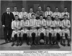 The team retained their First Division title in 1924–25 after only one loss in the last 27 league matches.[16][17] Huddersfield only conceded 28 goals and never conceded more than two per game; the first time a team accomplished this feat.[16][18] Another notable feat was achieved in October 1924, as Billy Smith became the first player in history to score directly from a corner.[19] After winning successive league titles, Chapman left for Arsenal, which offered to double his wages and attracted larger crowds than Huddersfield.[20] Cecil Potter was brought in as his successor. Under Potter, Town became the first club to win three successive English League titles in 1925–26.[21] The team came close to winning a fourth consecutive title the following season, but only won one of their last seven matches and thus handed the title to Newcastle United.[22][23] Town won the "wrong double" in the 1927–28 season; they finished runners-up in both the league and lost the FA Cup Final.[6]